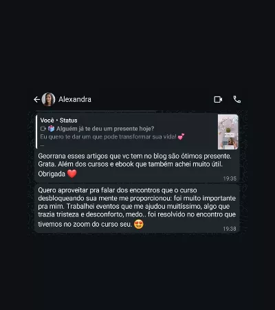 E eu entendo. É por isso que, além de toda a base terapêutica aplicada no curso, você ainda recebe suporte direto comigo e acesso a uma comunidade de alunas dentro da plataforma.