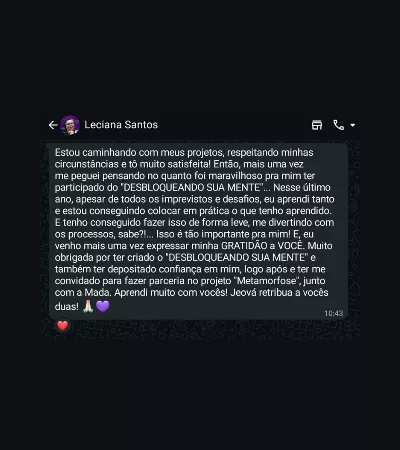 É justamente aqui que o Desbloqueando Sua Mente entra: para ajudar mulheres como você a quebrar o ciclo de frustração, transformar crenças em força interior e resgatar sua confiança para criar uma vida com mais liberdade, segurança e amor-próprio.